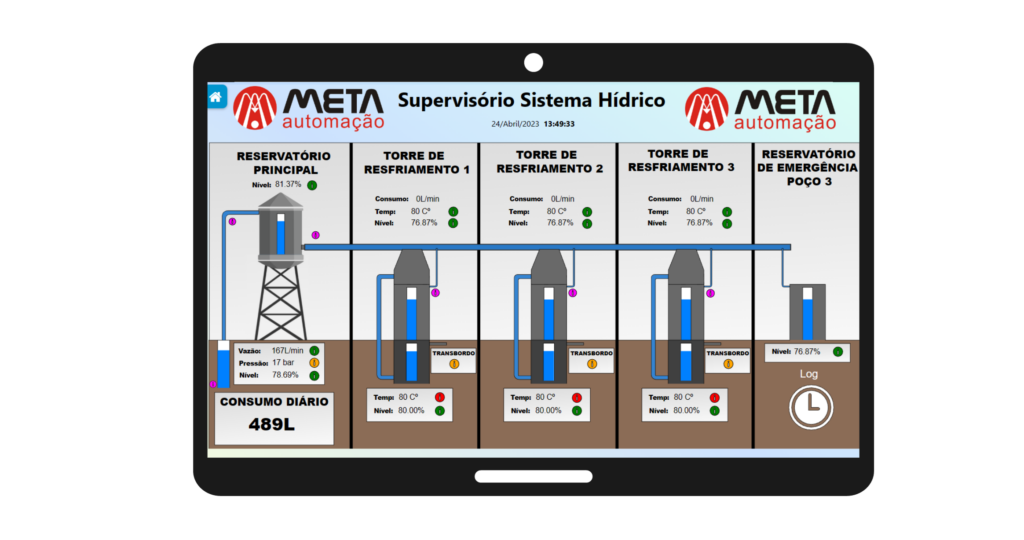 Painel com CLP e expansões analógicas Mitsubishi operando como remota de rede para sistema supervisório desenvolvido pela Meta Automação para monitorar nível, pressão, vazão e temperatura de sistema tratamento de água industrial.