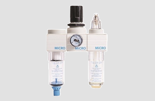 Unidade FRL de tratamento do ar, filtro, regulador mais lubrificador, com corpos e copos plásticos (conexões com insertos metálicos), com bloqueio no regulador.