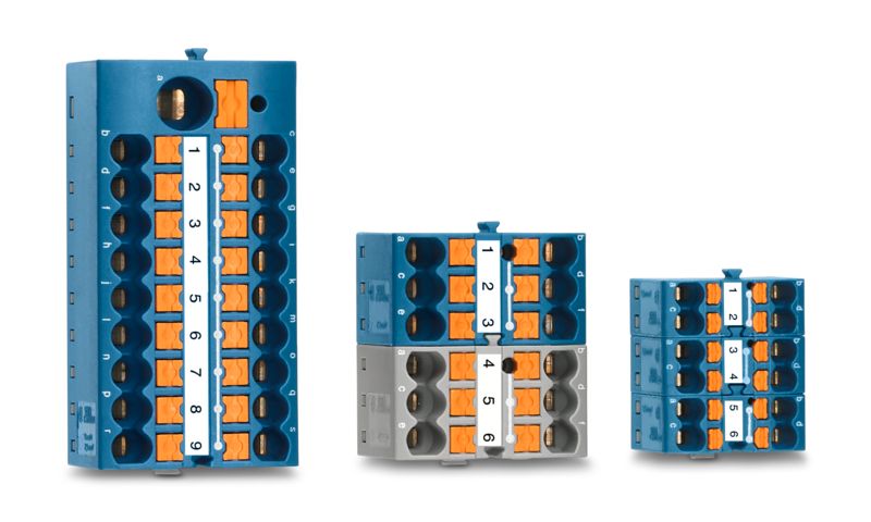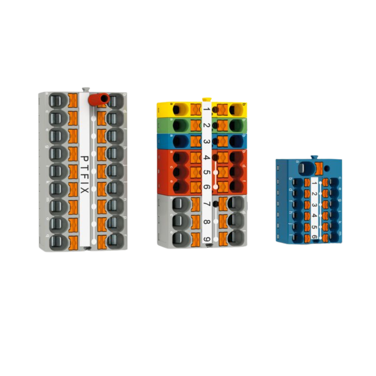 Os blocos de distribuição PTFIX são caracterizados pela conexão push-in frontal. Os blocos têm uma ponte integrada, em que cada bloco carrega um único potencial. Você recebe blocos PTFIX com 4, 6, 12 e 18 pontos de conexão e discos individuais com dois pontos de conexão. Os blocos de distribuição estão disponíveis com ou sem alimentação adicional. Com relação à bitola nominal, você pode escolher entre 1,5, 2,5 e 4 mm². Além disso, estão disponíveis blocos de distribuição com uma bitola nominal de 10 mm². Graças à existência de 15 variantes de cor (10 mm² = cinco variantes de cor), é garantida uma fácil atribuição de cores aos condutores e ao ponto de conexão.