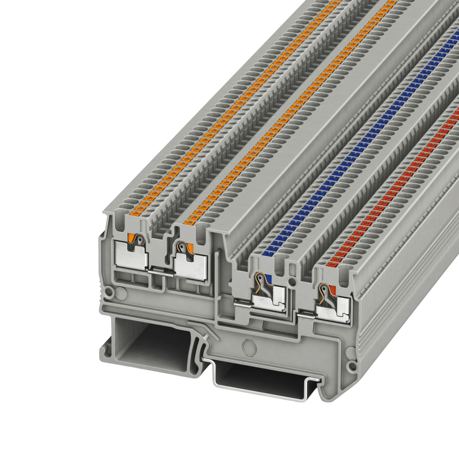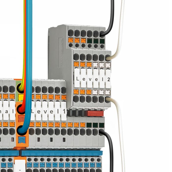 Na variante padrão, os bornes de sensor com conexão push-in possuem um gatilho de acionamento laranja nos dois níveis de sinal. Para a distinção fácil dos níveis de sinal também estão disponíveis variantes com gatilhos de acionamento pretos e brancos. Na variante preto-branco, o borne cumpre a norma EN 60947-5-2. Conforme a norma, este tipo de codificação por cores está previsto para o cabeamento de sensores, de modo a distinguir entre o contato normalmente fechado e o contato normalmente aberto.