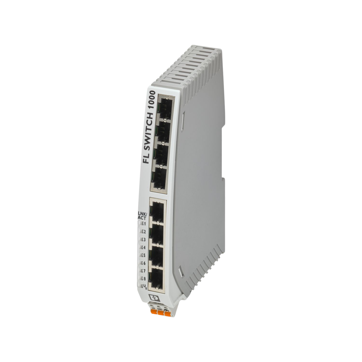 Switch Ethernet reduzido, oito portas RJ45 com 10/100 MBit/s em todas as portas, detecção automática da velocidade de transmissão, função autocrossing e QoS.