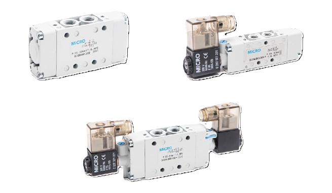Válvulas 5/2 de atuação pneumática ou elétrica, com atuador manual mono e biestável.